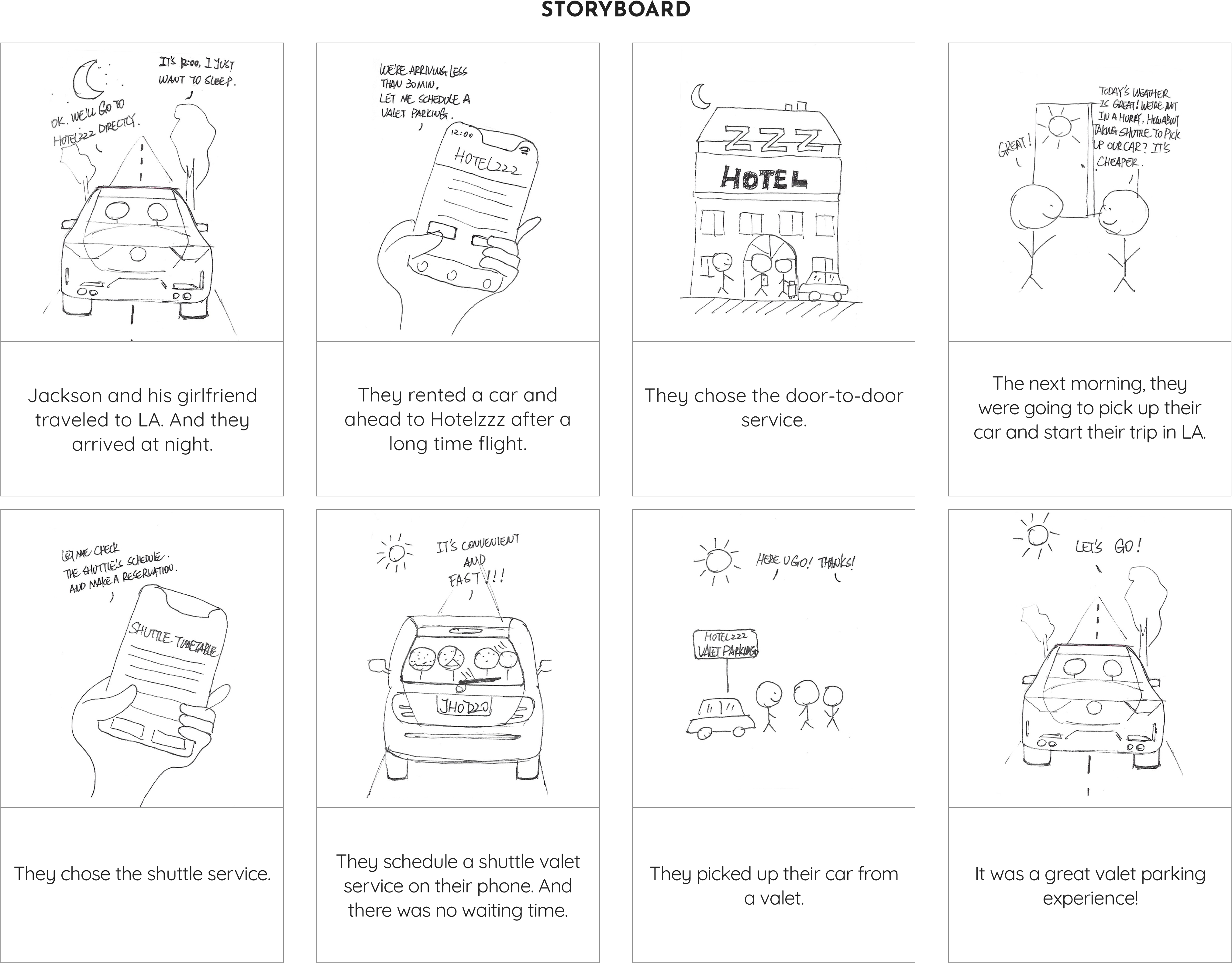 After having a clear picture of what the users were going through, I brainstormed and created a storyboard to show the user journey when people using the product of Hotelzzz to schedule a valet parking service from beginning to end.