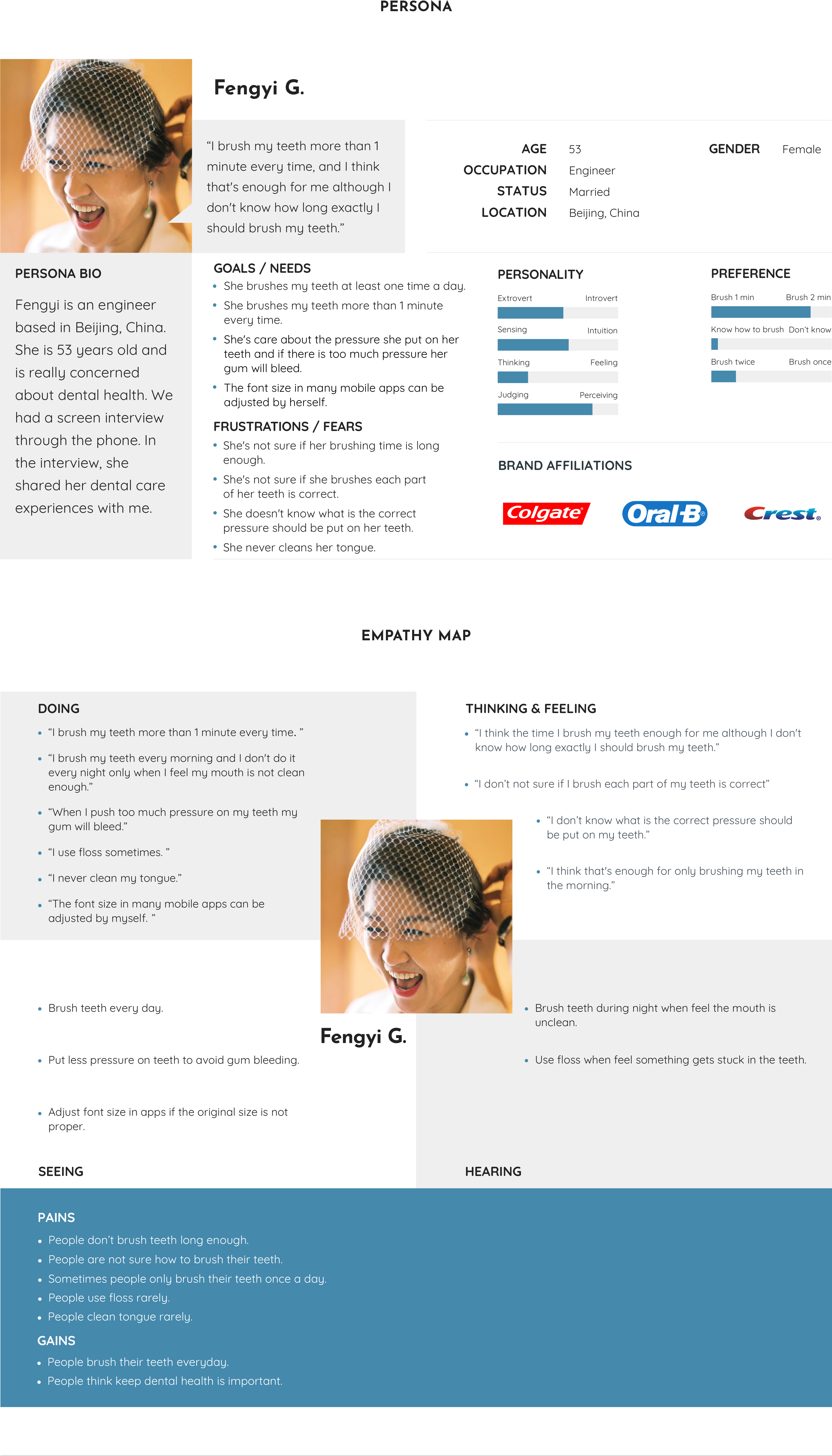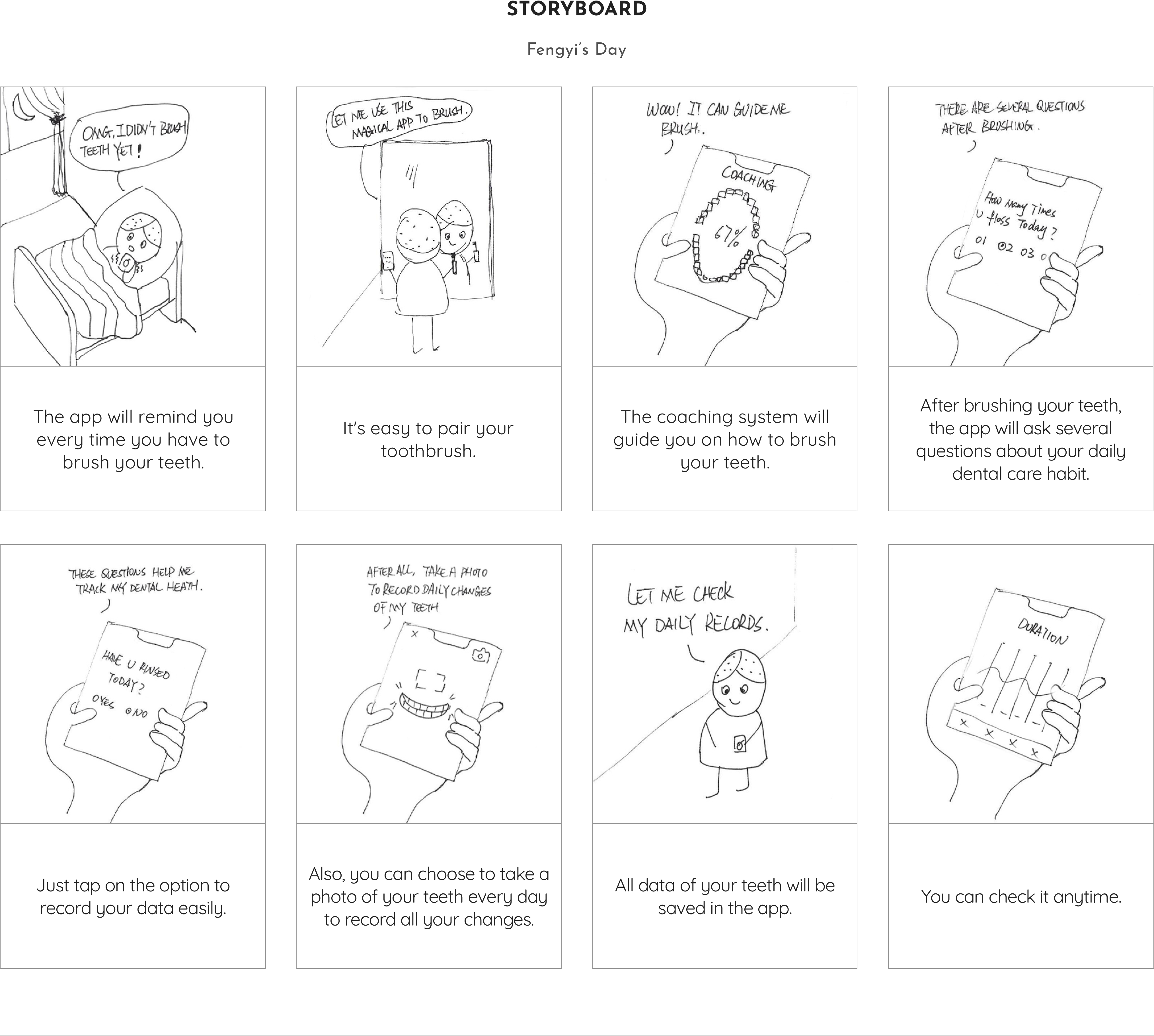 As an industrial design student during my graduate school period, I have written a thesis titled "Guidelines for Designing Handheld Tools for the Elderly" and developed an electric toothbrush design project. Inspired by this project, I want to extend an app to cooperate with the toothbrush, help people, especially the elderly, keep their teeth healthy.