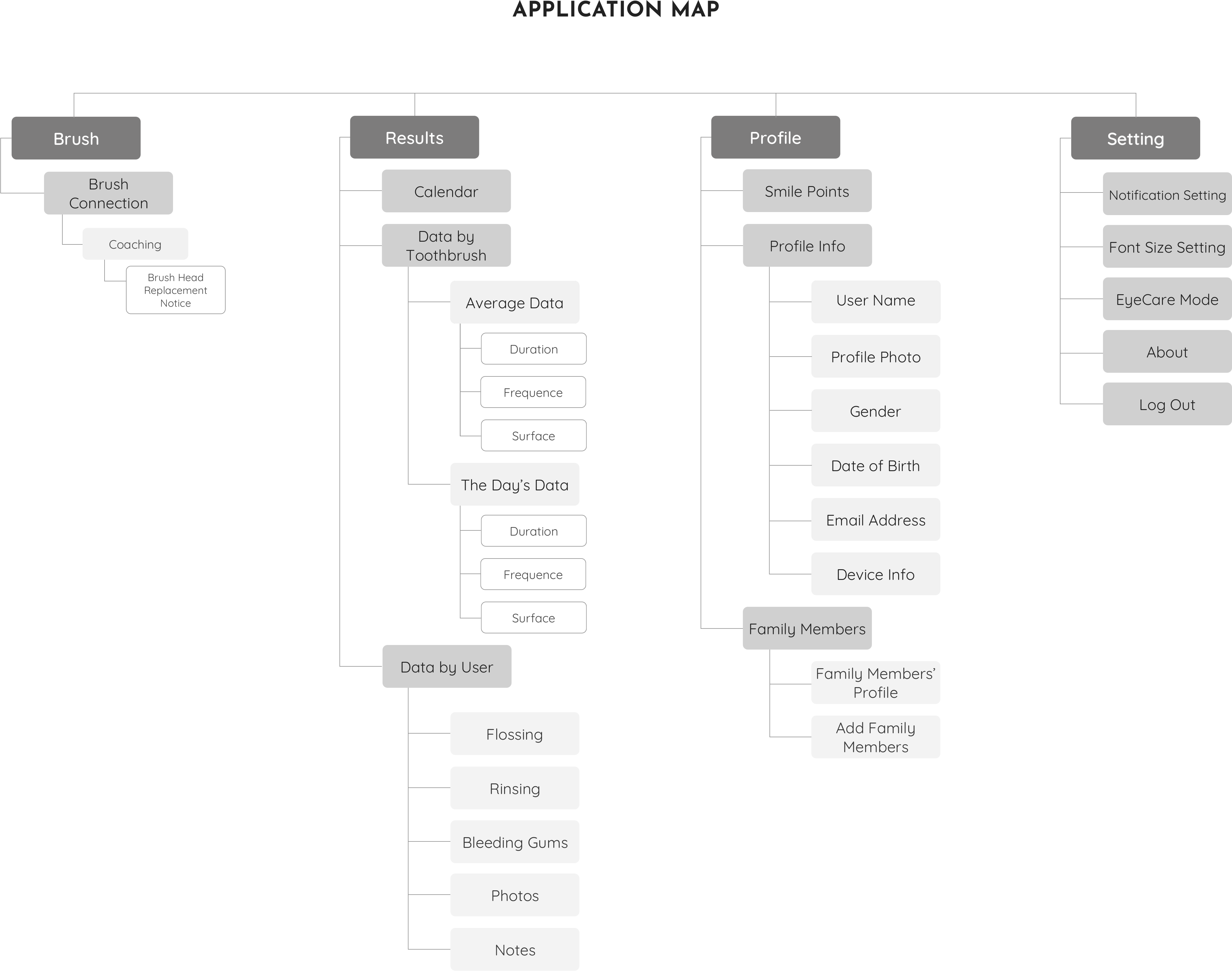 The User Flow visualizes the path a user would take to complete a task. In this case, the flow is mapping out the path possibilities from entering the app through completing a brush process.